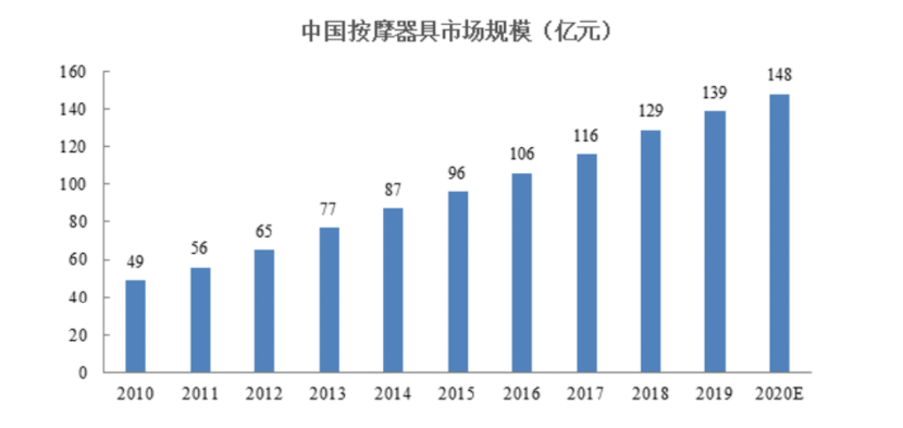 另一个值得关注的是按摩器具市场,据前瞻产业研究院数据显示,中国已经成为了全球按摩器具市场需求增长最快的地区之一,2010-2019年,中国按摩器具市场规模从49亿元快速增长至139亿元,2020年该市场规模预计将会接近150亿元。