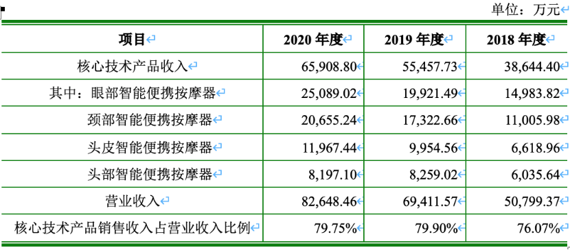 强大的技术能力储备和创新能力的产品化,直接能体现在销量数据上。招股书数据显示,倍轻松核心技术产品收入在近三年营收占比分别为76.07%、79.90%、79.75%,核心技术转化的业务贡献率近八成。这实际上也意味着,在按摩设备行业产品技术能力才是最关键的市场竞争优势。