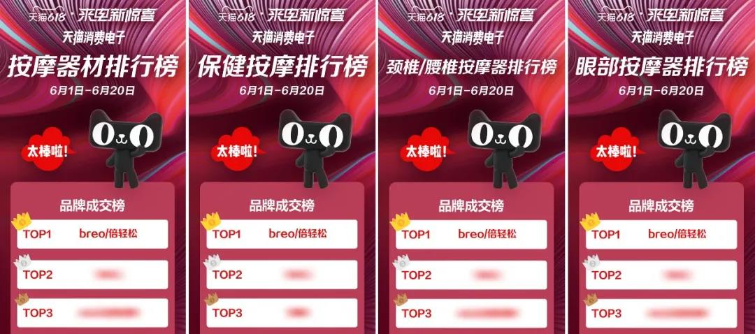 借助肖战在年轻用户群中的影响力,倍轻松得以快速进行品牌渗透与销售转化。倍轻松肖战同款产品销售超10万台,4天线上营业额破亿元。在今年618首日,倍轻松宣布获得天猫618眼部按摩器类、颈椎/腰椎按摩器类和按摩器材类三大品牌成交榜第一名,同时获得京东小家电健康类品牌TOP榜第一名。
