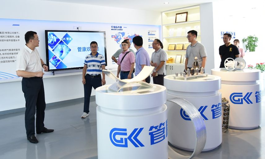 管康总经理贾健带领客人们参观管康,详细介绍了供水管道带压检测技术和德国引进的供水管道二元全结构修复工艺。管康副总经理李才禧、总工程师陈逸群、市场总监高俊岩陪同参观。管康副总经理李才禧为参观的一行客人介绍管康全德系技术施工装备和二元非开挖修复工艺。