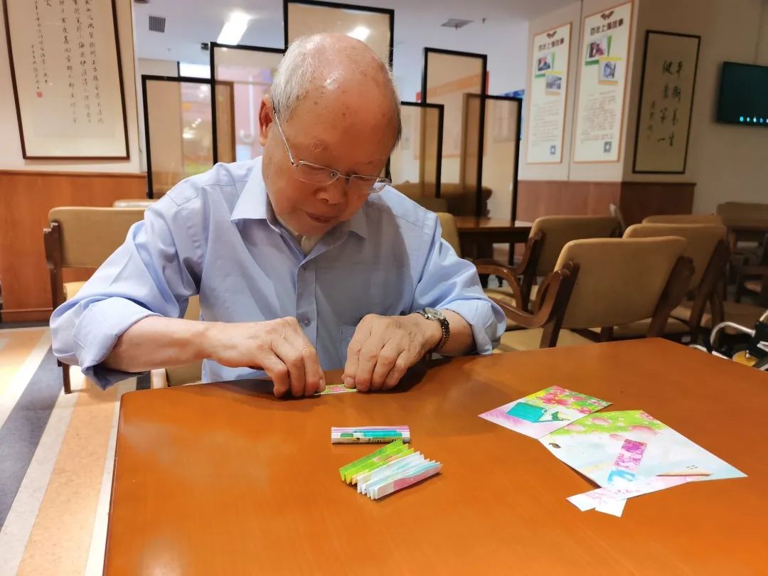 长者们拿着工作人员剪裁好的材料包,看到大大小小的纸张,有些困惑。“要跟着我的节奏,一步一步的做就好了,不要超前哦。”“哈哈哈”长者们边笑边跟着工作人员的节奏,一步一步制作起扇子。折叠扇面、包扇柄、添内线、加装饰,长者们的每一步都做的极为细致,长者们说,小时候也会自己用纸折扇子,只不过和我们这次做的不一样。