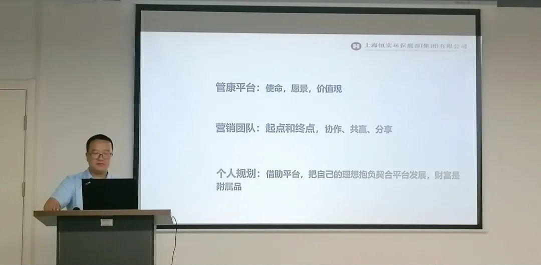 同时也邀请到上海管康副总经理—李才喜,为大家分享公司的发展历程,作为公司元老,他见证了恒实环能集团和上海管康的发展史,见证了过程中的艰辛和难关。李总通过谈案例和自身感受,与大家进行真诚的交流,让大家更加深入的了解公司的发展历程,也更加有信心共创未来的辉煌。