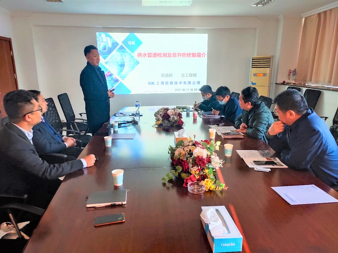 2021年11月8日,上海管康技术有限公司总工陈逸群带队亲赴南京水务集团进行技术交流。南京水务集团管网部部长王刚、南京水务集团管线管理主任潘玉明、南京水务集团原总工吴志成等莅临会议,双方在行业新技术、新工艺、新设备及相关应用案例方面,进行了充分的探讨和交流。