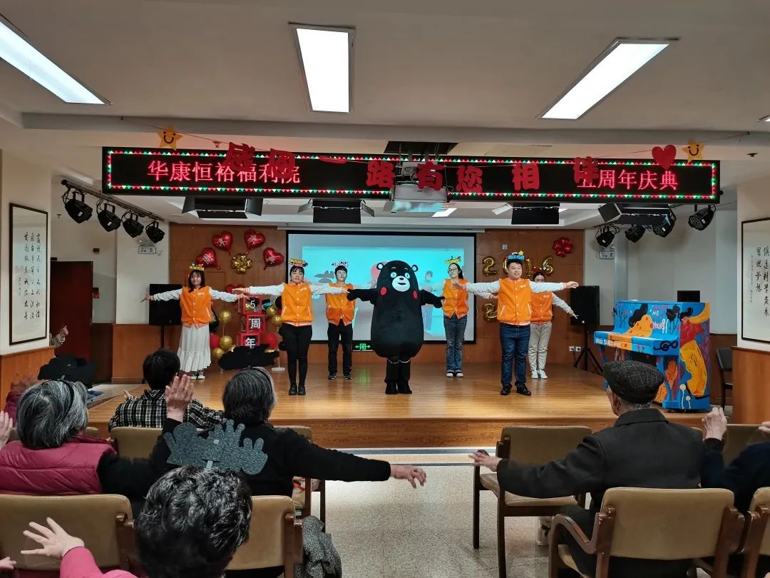 福利院的长者们每日早操时都会做元气操,在这一次的周年庆典中,福利院院办的员工们,为大家带来了精彩改编后的元气操,整齐的动作让长者们不禁跟着一起做起了元气操,而舞台上的熊本熊同样格外惹眼。