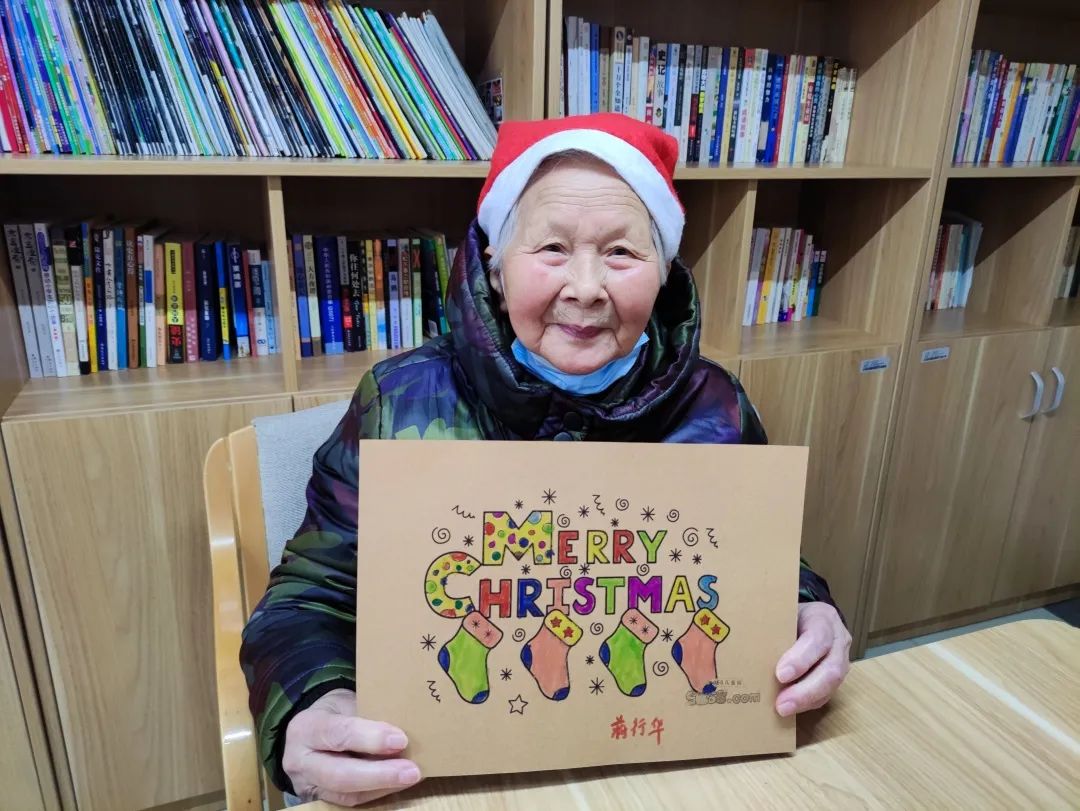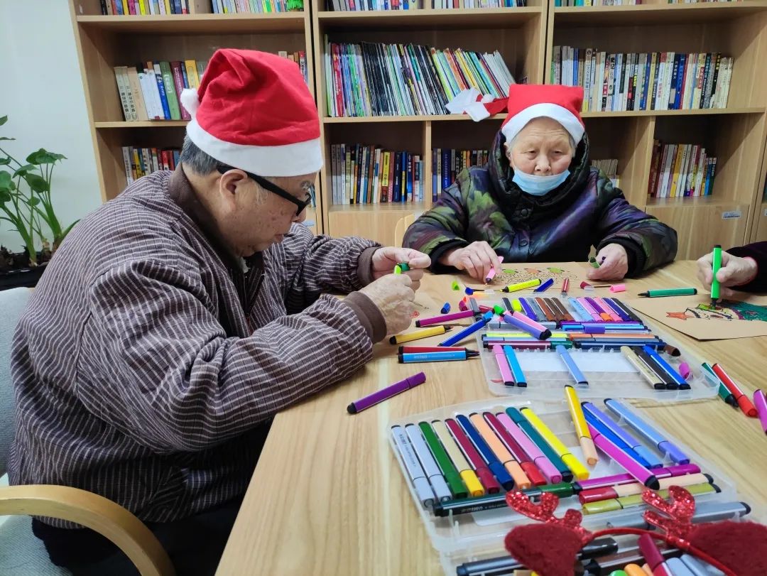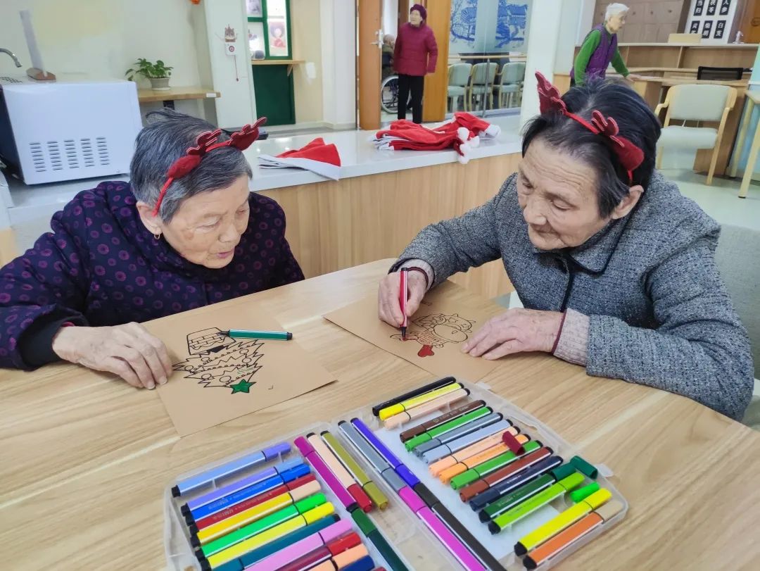 一边戴着喜庆的圣诞头饰,一边用画笔画出最萌的圣诞元素:圣诞树、圣诞袜、圣诞牛牛。也许这个冬天很冷,但是在北桥这个大家庭里,有了彼此的陪伴,处处充满温暖。在这个精彩的节日里,让爷爷奶奶们一同感受欢乐的节日氛围,祝愿大家都拥有一个幸福的圣诞节。