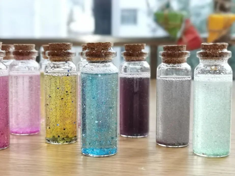 本次我们带领长者们制作的,是流沙许愿瓶。制作完成后,将许愿瓶对着光线,轻轻摇晃,亮片随着液体流沙般晃动,可以折射出了五彩的颜色。