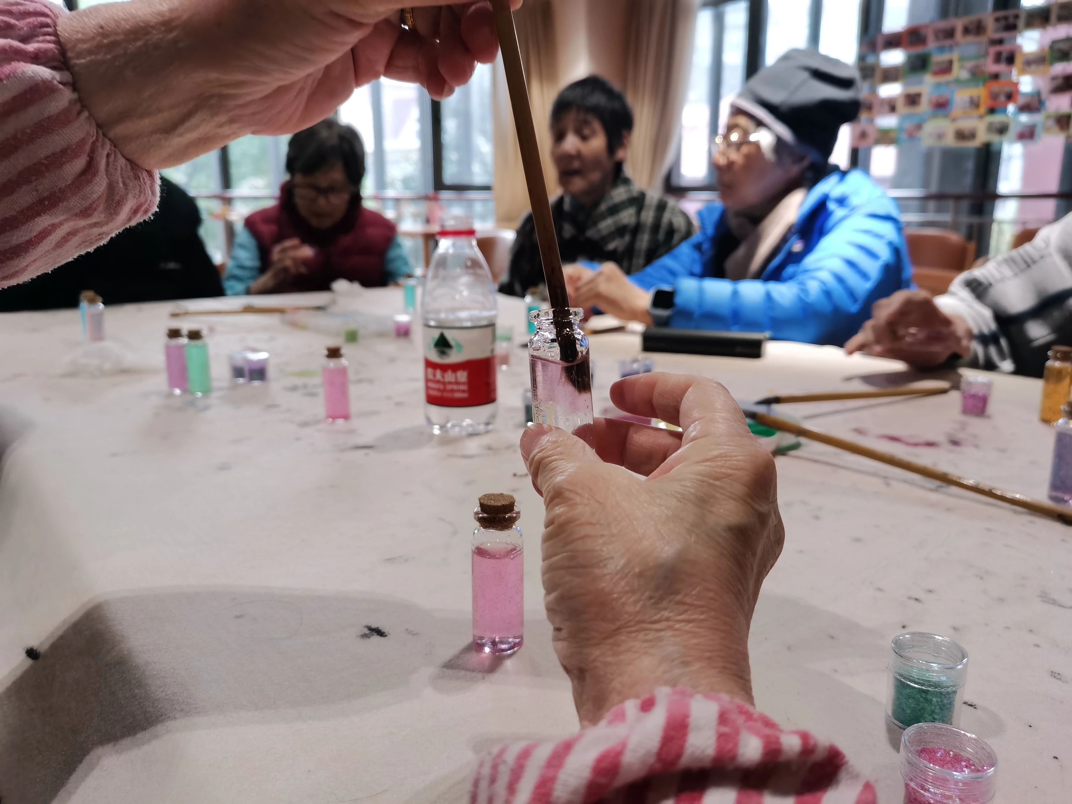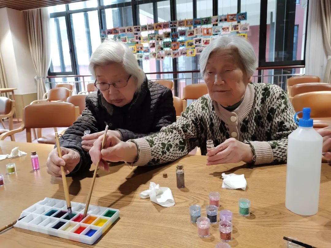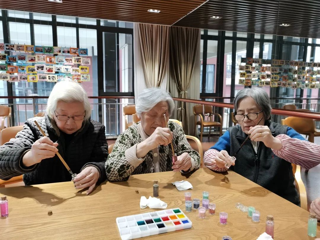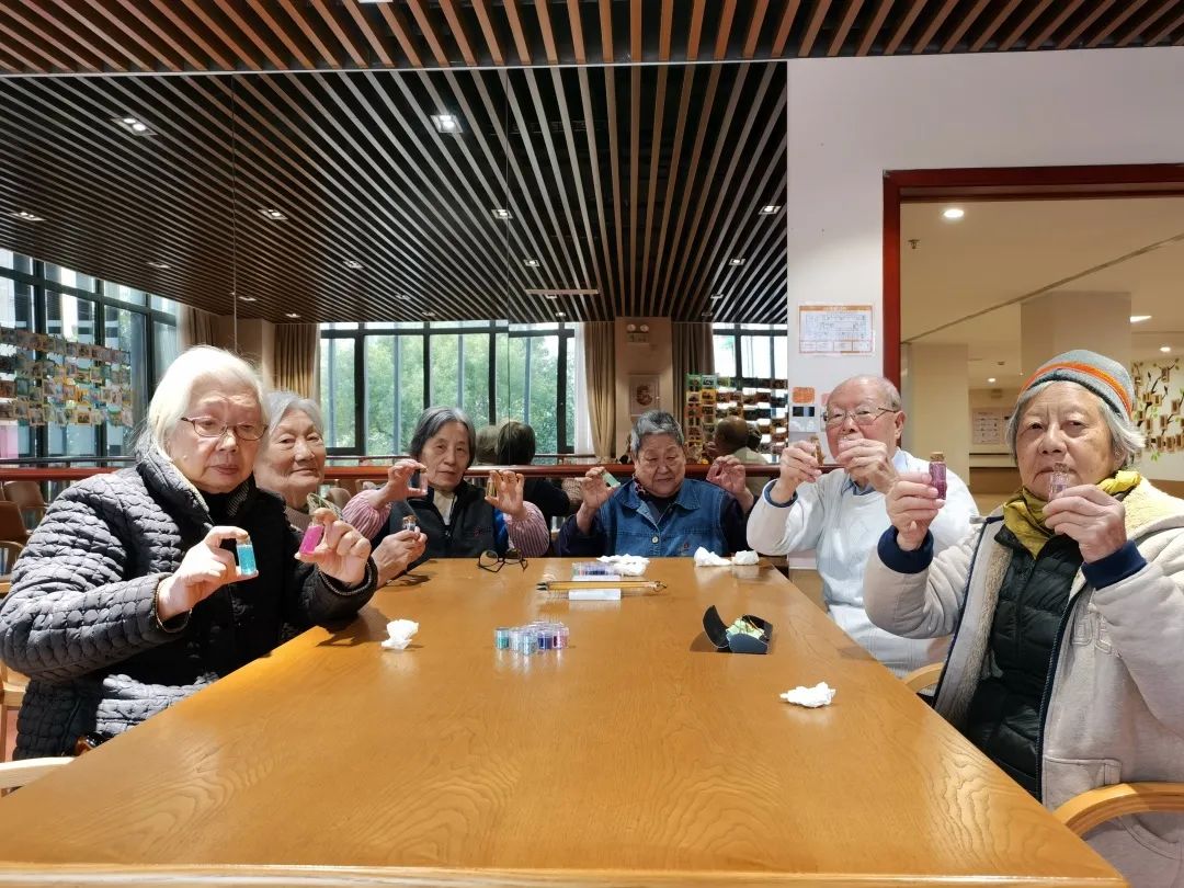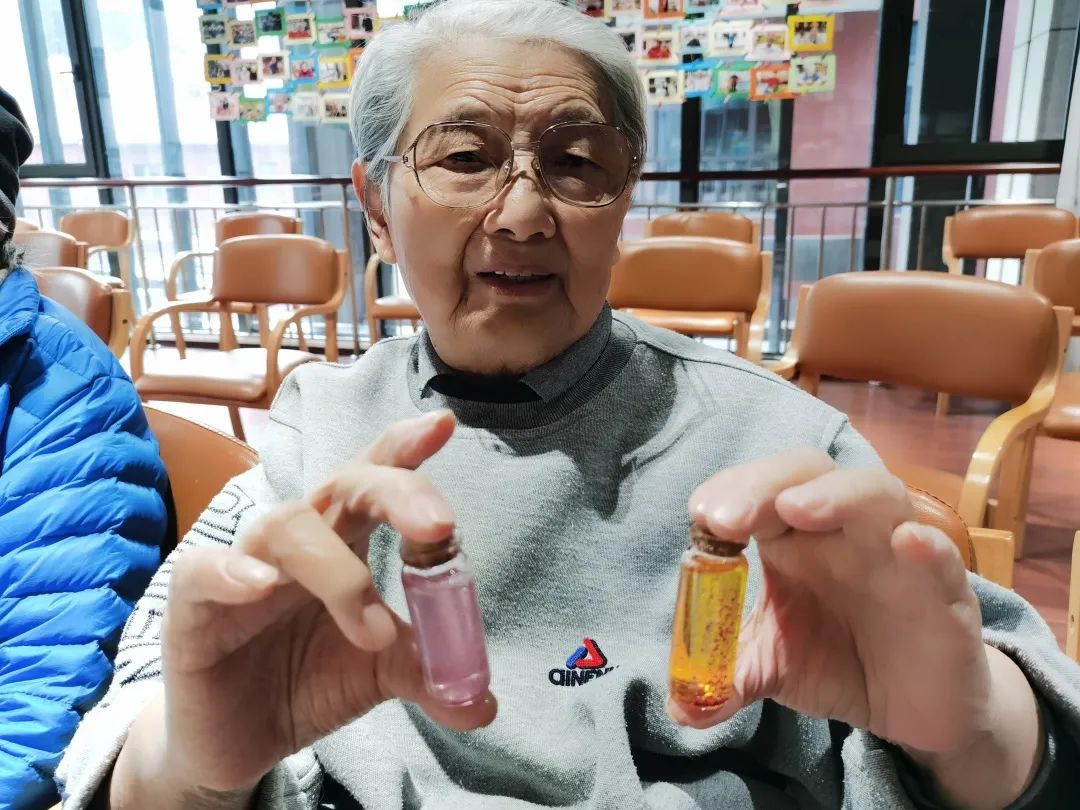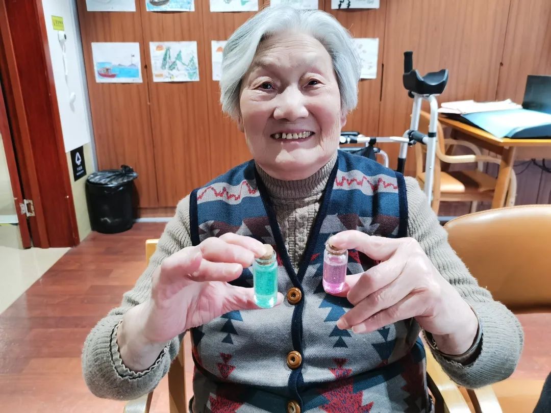 长者们每制作好一个许愿瓶,都不禁感叹颜色的美丽,长者轻轻晃动几下,仔细观看着亮片下坠的过程,一时间岁月静好,时光也仿佛放满了脚步。一支支许愿瓶,一个个美好的愿望。新的一年即将到来,愿新年胜旧年,愿来年一切安好,愿长者们身体健康,万事如意!