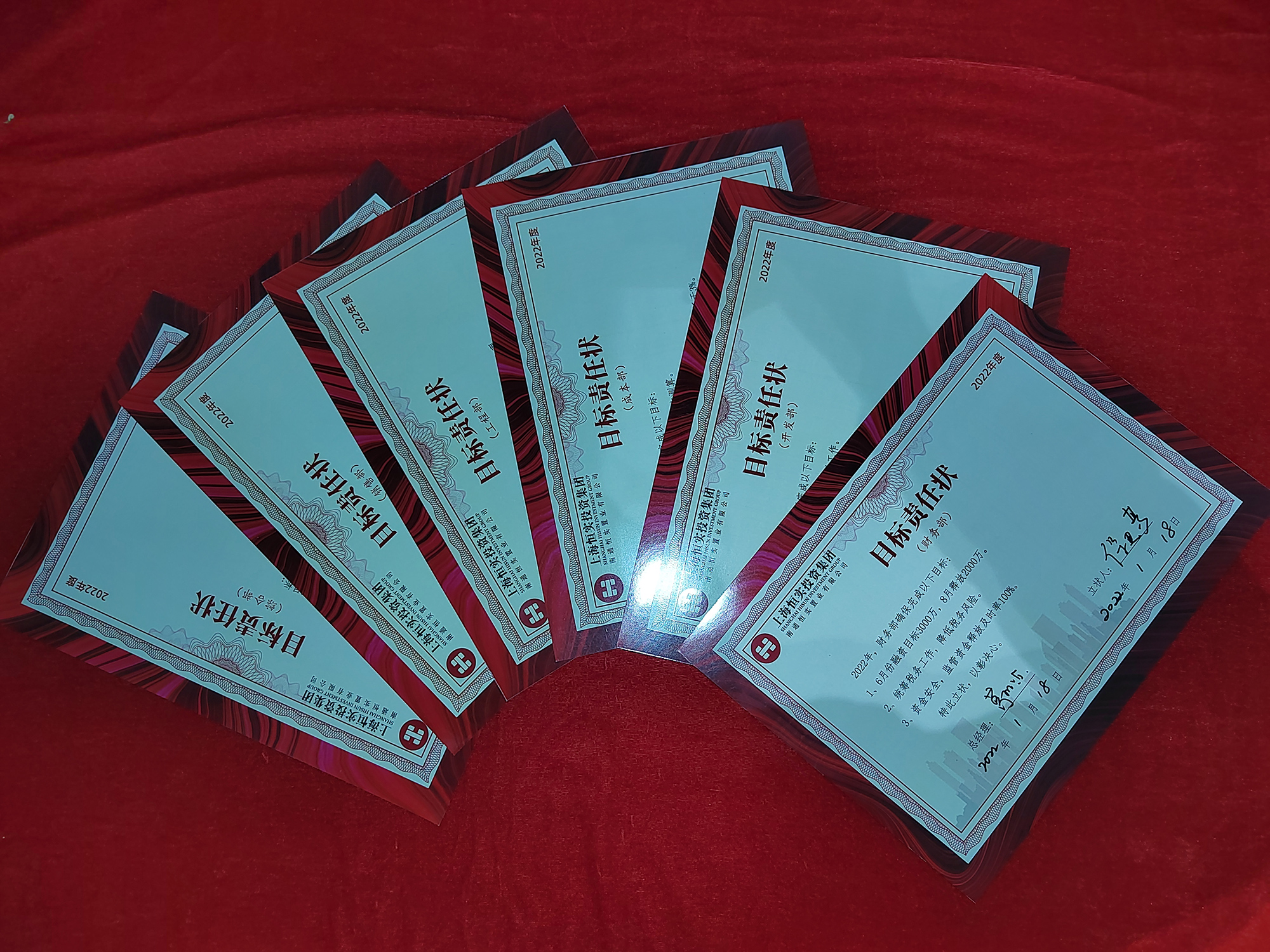 会议结束前,各部门负责人签署了2022年度目标责任状,从工程进度、成本管控、销售回款、开发节点、资金保障、后勤支持等方面承责,彰显工作决心。