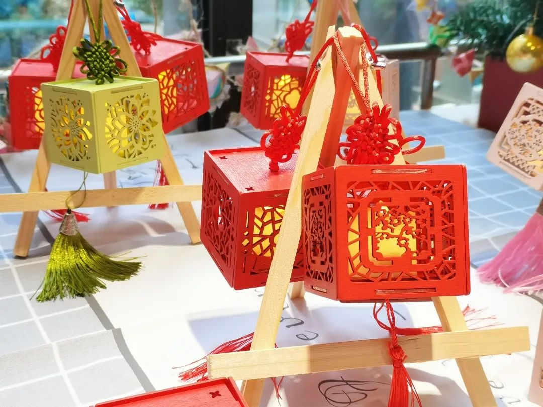 打开开关,柔和的光线透过镂空的木片,增添了一份浪漫。长者们都说,今年的元宵节过得很不一样,亲手制作灯笼更有趣。