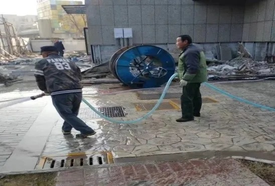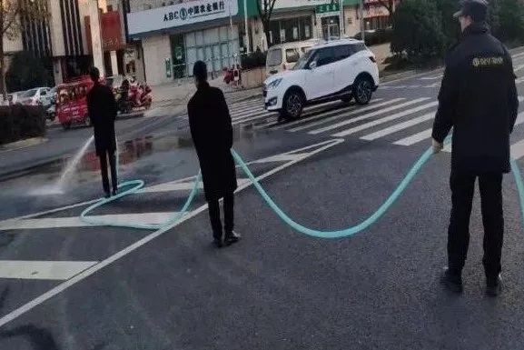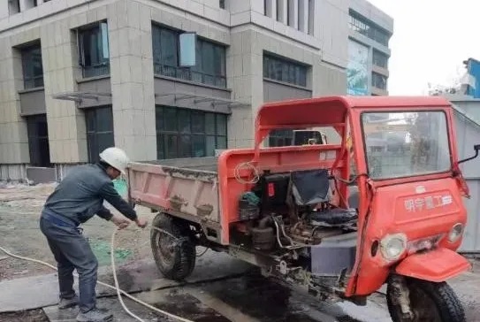 工作人员对施工外道路及沿途路面进行冲洗