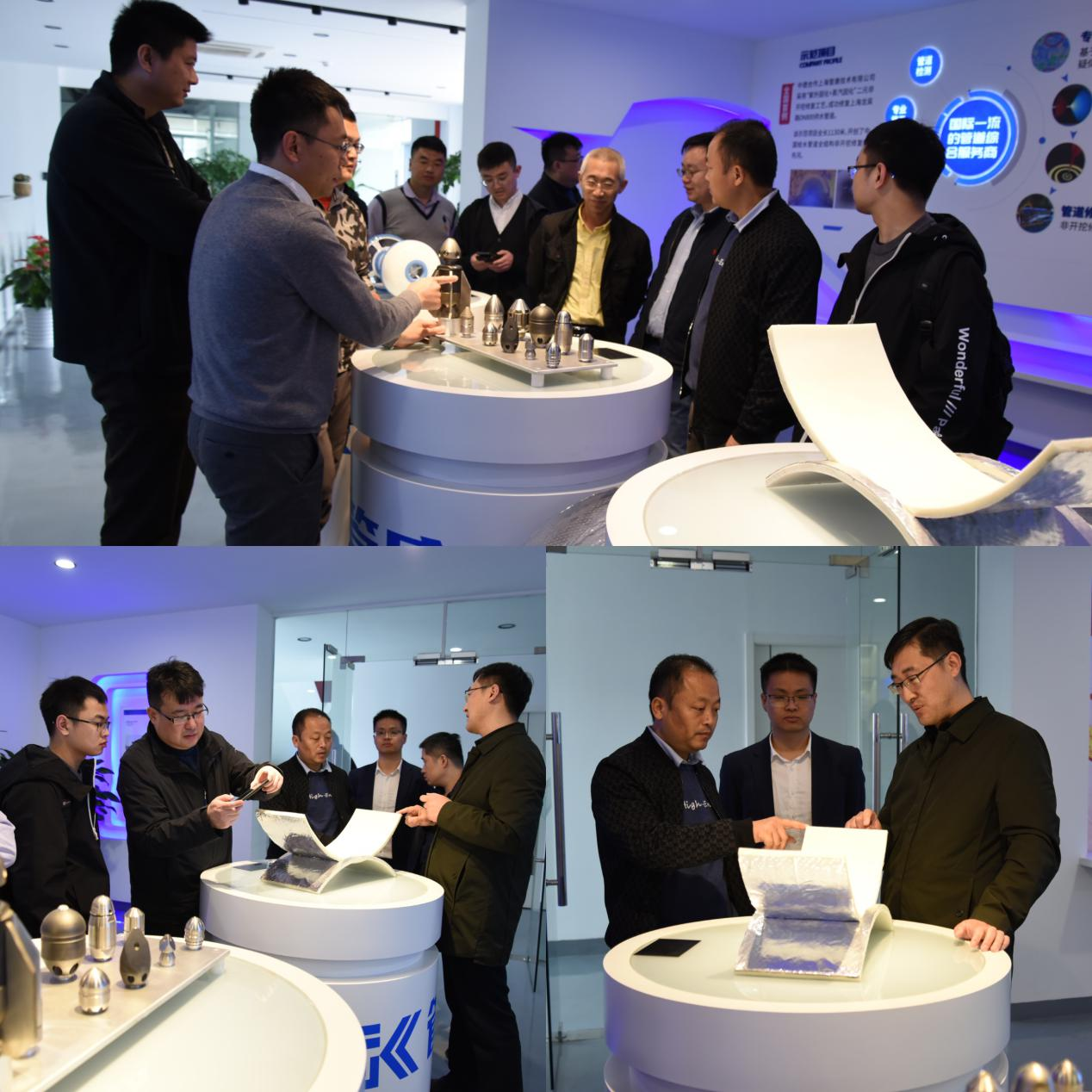 技术部经理刘林带领客户参观管康技术设备研发基地,详细介绍了德国引进的供水管道二元全结构修复技术工艺、工程装备和带压检测技术。