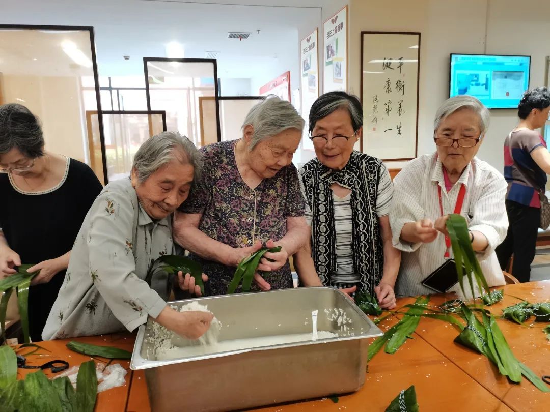 长者们在包粽子的过程中,还会互相请教,你教我包三角粽,我教你包枕头粽。有的长者,不会包粽子,在活动中,工作人员充当起小老师的角色,教长者们如何包粽子。“这里不好漏米”“那里要用粽叶盖住”,长者们一边复习着小老师讲述的技巧,一边动手包着粽子,渐渐地,长者们掌握了包粽子的技巧,欢声笑语陪伴着每一位长者。