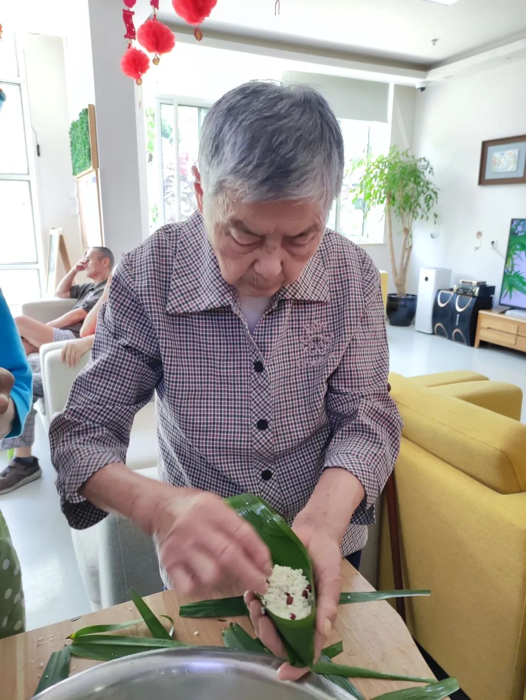 大家齐刷刷上阵,无论技术如何,重在参与。在参与的长者里,林奶奶(认知症前期,经常忘记最近的事情)包粽子的的手法特别娴熟,一看架势就知道肯定是包粽子的好手,她高超的技术引来了许多长者和护理员驻足观看。