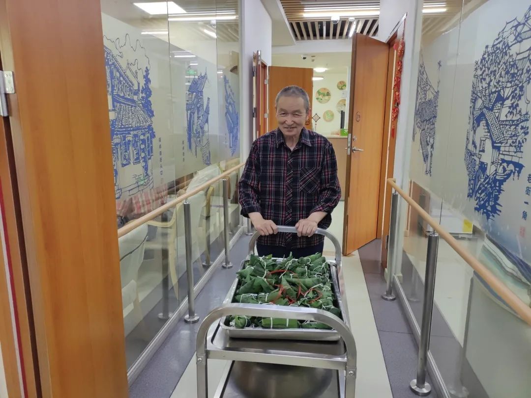 何爷爷(认知症前期,平常是单元里家务活的包干者)推着包好的粽子迈着轻快的步伐,把粽子送到食堂,虽然粽子还未下锅,但是走过的地方已经能闻到阵阵的粽叶特有的清香。