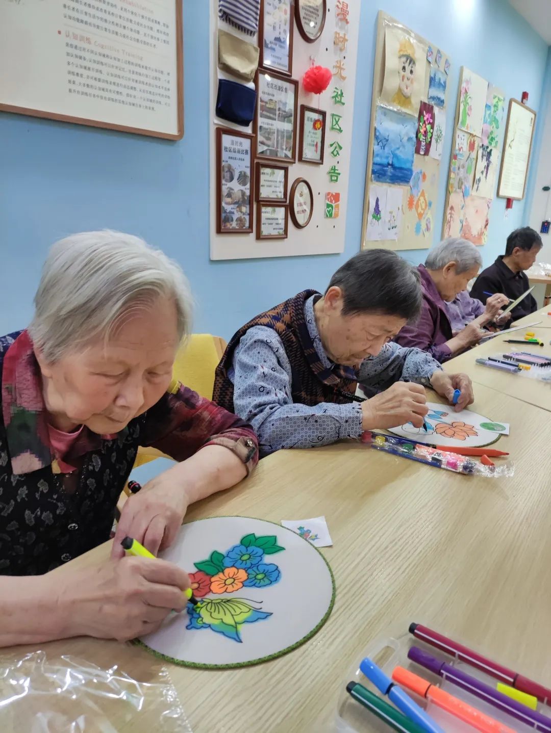 我们给爷爷奶奶奶们准备了颜料和彩笔,让爷爷奶奶能够自由的选择自己喜欢的绘画材料,方奶奶挑选了一把荷花扇,拿起画笔就认真细致的画了起来,卢奶奶特意摘下了眼镜,能够更加清楚的看清手中的图案,蒋奶奶挑选了几个自己喜欢的颜色,认真的给花朵上色……每位爷爷奶奶都很认真的对待自己手中的作品。
