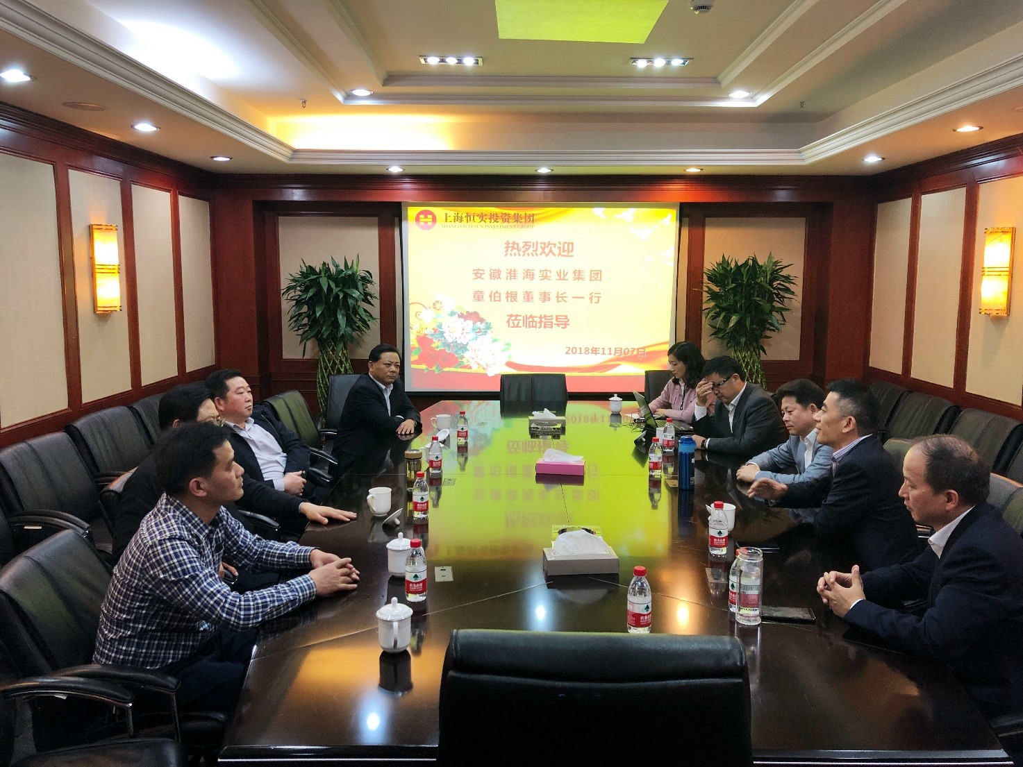 2018年11月7日,安徽淮海实业集团童伯根董事长率团队至恒实集团考察交流。集团董事长聂建明、集团旗下华康CEO王东峰、副总裁朱斌、副总裁张婕、集团运营总监王聂才一起参与座谈交流。