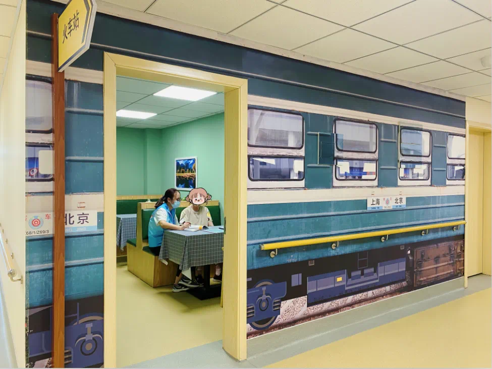 在空间布局上,养老院结合长者生活背景和兴趣爱好,对环境进行专业设计,制定从主动预防到精准干预的全周期空间服务方案。同时,作为3.0版认知障碍专业照护养老机构,鲁坤养老院对6种认知障碍功能障碍规划6种干预疗法,通过18项干预工具提炼“6618”的干预方法与环境相融合,根据本地长者的饮居风俗习惯,通过模仿真实社区生活场景,将“记忆列车”“忘不了茶馆”“艺术角”“解忧杂货铺”“广智学堂”“星乐坊”“夜读俱乐部”“积极沙龙”“手工坊”串在一起,形成一个“真实的社区”生活场景,模糊照护机构与社区之间的边界,让长者在此获得愉快和真实的体验。 沉浸式生活场景1:记忆列车 一辆绿车皮的记忆列车,带着独属于老上海的特色记忆,让长者将记忆带回到过往的黄金岁月。这里以过往生活中的老物件作为记忆触发点,通过空间布置,营造一个熟悉的环境缓解长者焦虑情绪,对于经常想收拾好行李,准备提包回家的长者可以有一次愉快的乘车旅行。