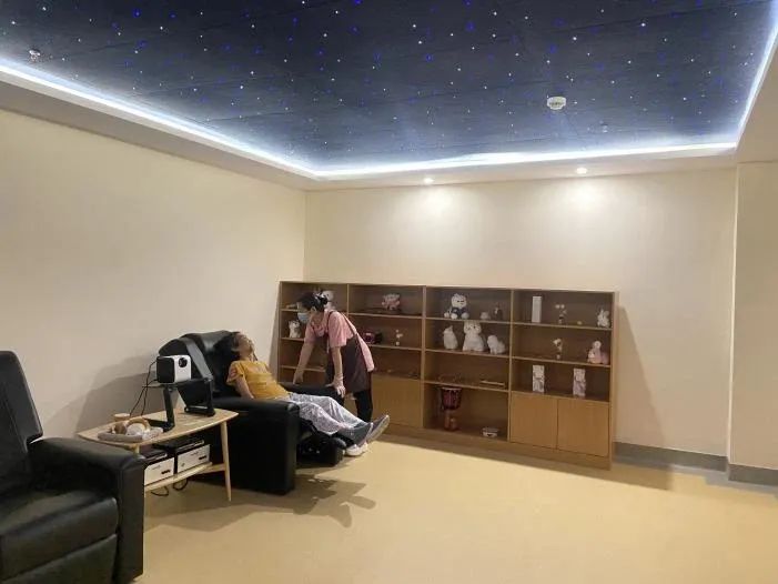 星乐坊的区域设计灵感来自于老子的“无形生有形,有形生万物”,为精神追求较高的长者打造沉浸式环境营造,整体布局简约不简单。触感丰满柔软的皮质沙发,搭配简洁清新的小绿植,音乐疗法、芳香疗法、宠物疗法相融合,利用星空画面、舒缓音乐、香气和触觉物体等媒介提供视觉、听觉、嗅觉、味觉、触觉等多种感官刺激,帮助长者实现内心的平静,改善其认知状态,促进情感表达。